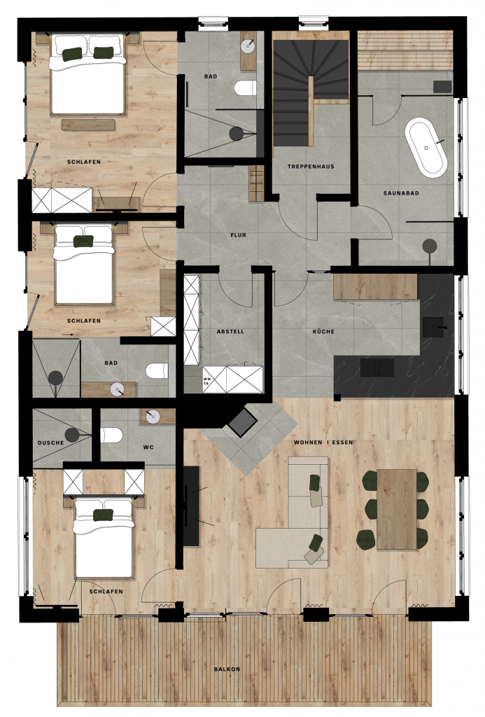 Direkt am Wohnzimmer anbindend, befindet sich der großzüge Balkon mit 20 Quadratmetern. Dabei gibt es ganzjährig eine Entspannungs & Liegelounge. Bis auf den Winter haben Sie die Möglichkeit bei der Sitzloungecke Platz zu finden, um bei dem ein oder anderen Getränk die Aussicht zu genießen.